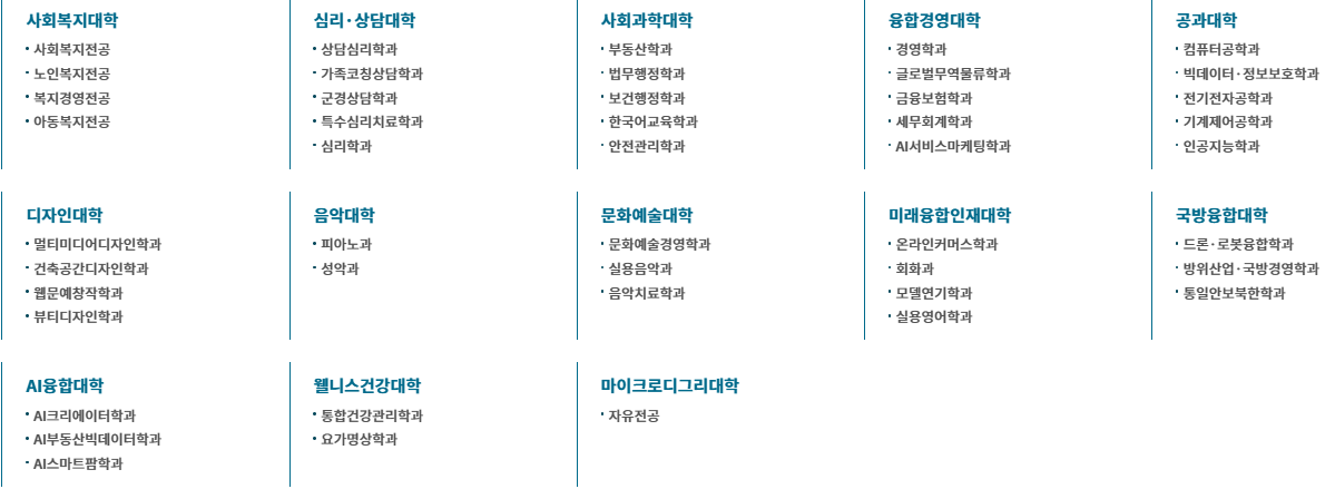 웬만한 종합대학과 비교해도 꿀리지 않는 학과 수입니다. 일반적으로 볼 수 있는 학과들도 있지만 아무래도 학문보다는 실무적인 내용을 많이 다룰 것 같은 학과들도 보입니다. 예를 들어 부동산학과, 온라인커머스학과, 음악치료학과, AI 관련 학과, 요가영상학과 등이 그러해 보이네요.