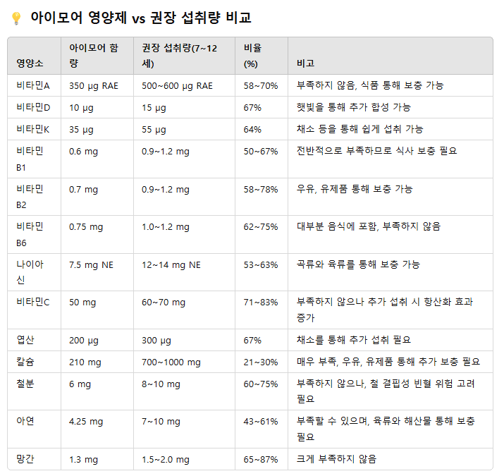 아이하이 사이트에 나와 있는 아이모어의 성분입니다. 이를 7~12세 아이들의 하루 권장 섭취량과 비교하여 어느 정도 함량을 포함하고 있는지 확인해 보겠습니다.