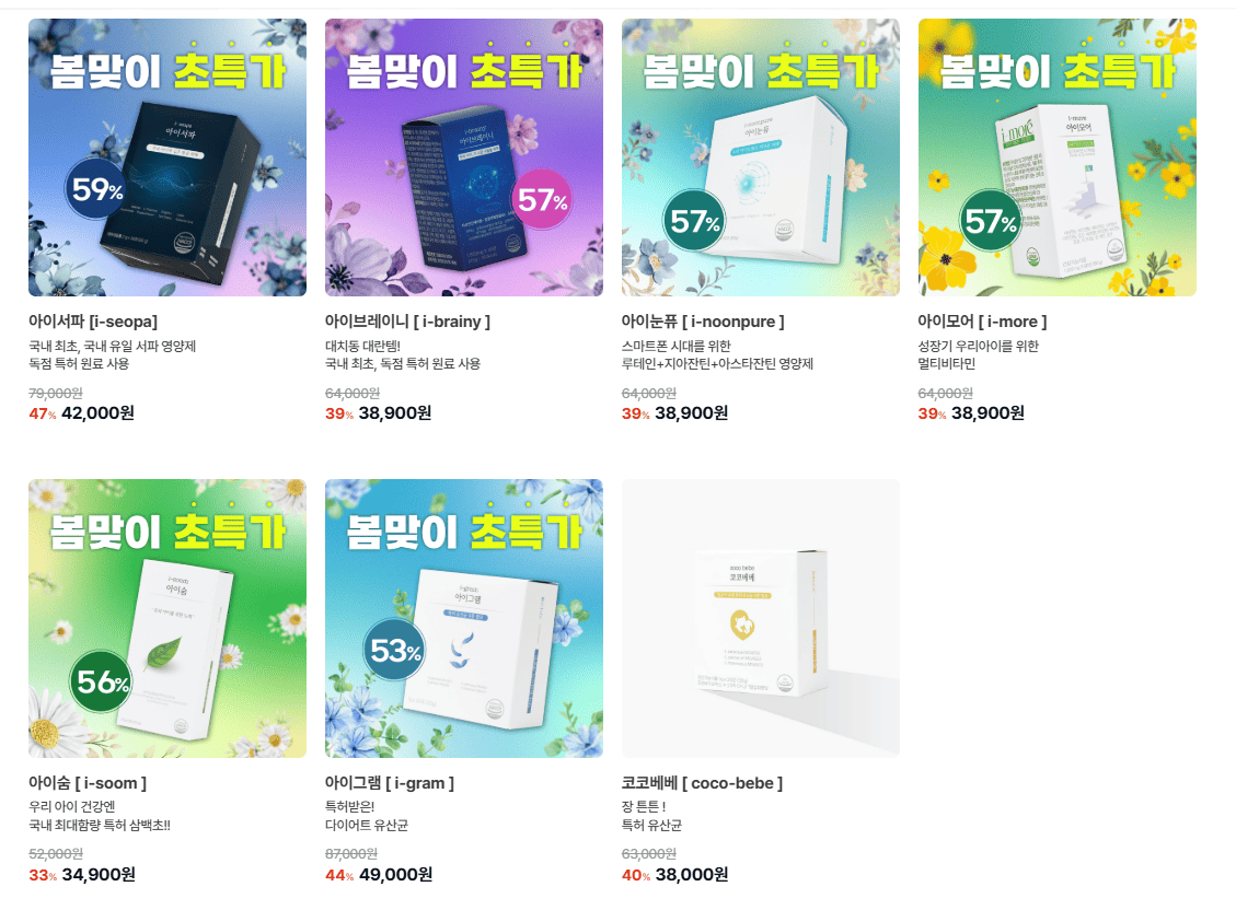 아이하이에서는 총 7개의 제품을 판매하고 있습니다. 이 중에서 아이 키 성장과 관련된 제품은 아이서파와 아이모어입니다.