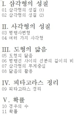 중학교 2학년 2학기 수학 목차를 보시면 1학기는 주로 대수적인 파트를 다뤘던 것과 다르게 이번 파트에서는 기하적인 파트와 확률 파트로 이루어져 있는 것을 확인할 수 있습니다. 앞선 글에서도 설명했듯이 중학교 수학 교육 과정은 주로 1학기에는 대수적인 파트, 2학기에는 기하적인 파트와 확률과 통계에 관련된 내용을 다룹니다. 그리고 이 내용들은 각각 고등학교 수학 선택과목인 미적분, 기하, 확률과 통계로 이어집니다.